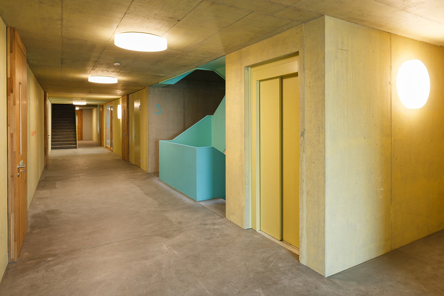 In the project Kalkbreite the Rue Intérieure, an internal development cascade, functions as the central artery of the building and creates connections between different units such as various common spaces and commercial and cultural spaces in the building. It creates a structural unit out of the seven staircases (Schindler 2014, p. 31). Starting in the hall, the Rue Intérieure is a meeting, exchange and residence point (Genossenschaft Kalkbreite n.y.) which offers various uses like an exchange board. It is a corridor that connects all apartments, common spaces, roof gardens and runs alternately on different floors (Genossenschaft Kalkbreite 2014, p. 8) through the energy- and form-efficient and therefore very deep building. Residents and guests can follow the Rue Intérieure in a loop through the entire building. This internal street is 2.5 meters wide, also serves as an emergency exit and has a sophisticated color design, which creates an attractive visual experience and supports its guiding function.