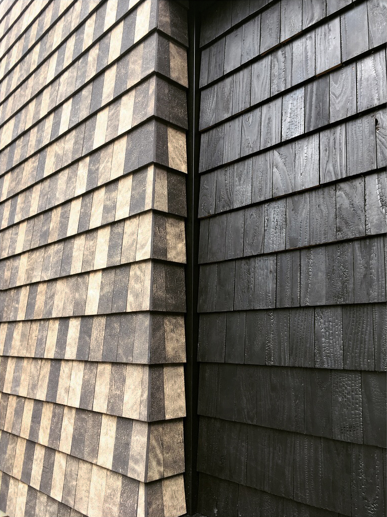 Façade with a reusable assembly system: demountable clay and burnt reclaimed wood