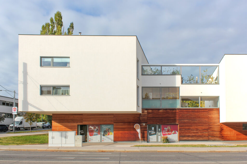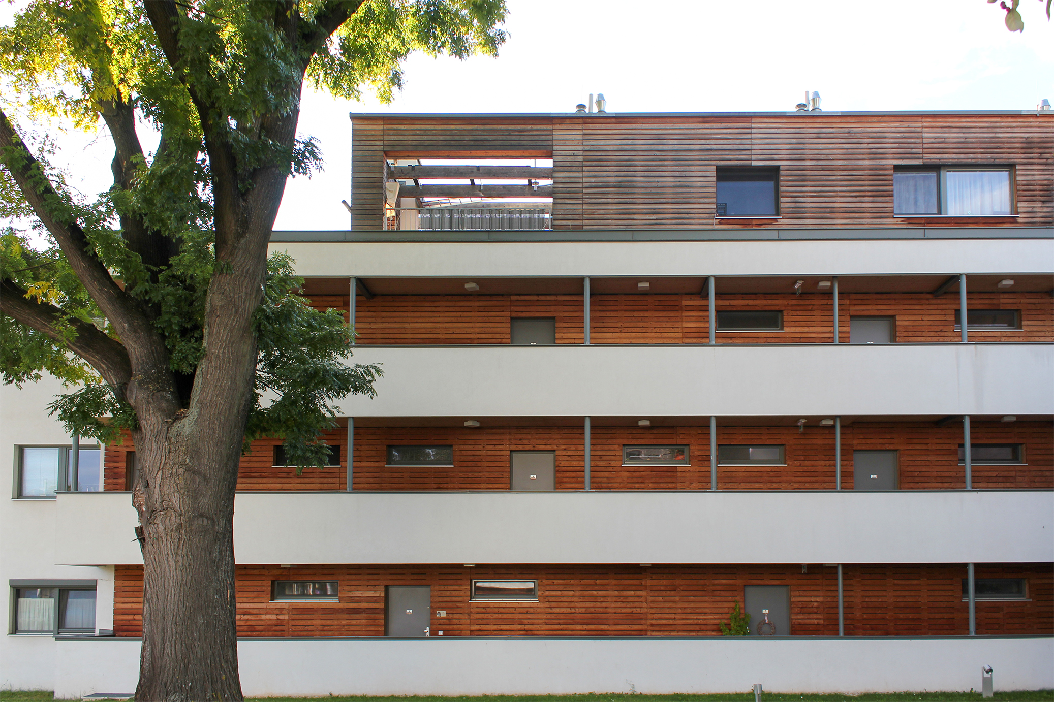 The Generationenwohnanalge in Vienna is a three- to four-storey housing complex in wooden construction. The buildings are arranged in a U-shape, creating a green common courtyard for recreation and exercise. They provide space for 55 flats including senior flats, a senior club and a children’s group. The flats are arranged in such a way that they are optimally lighted and face the green space. The pergolas serve as access to the flats, as common and also provide protection from the noise of the busy street.