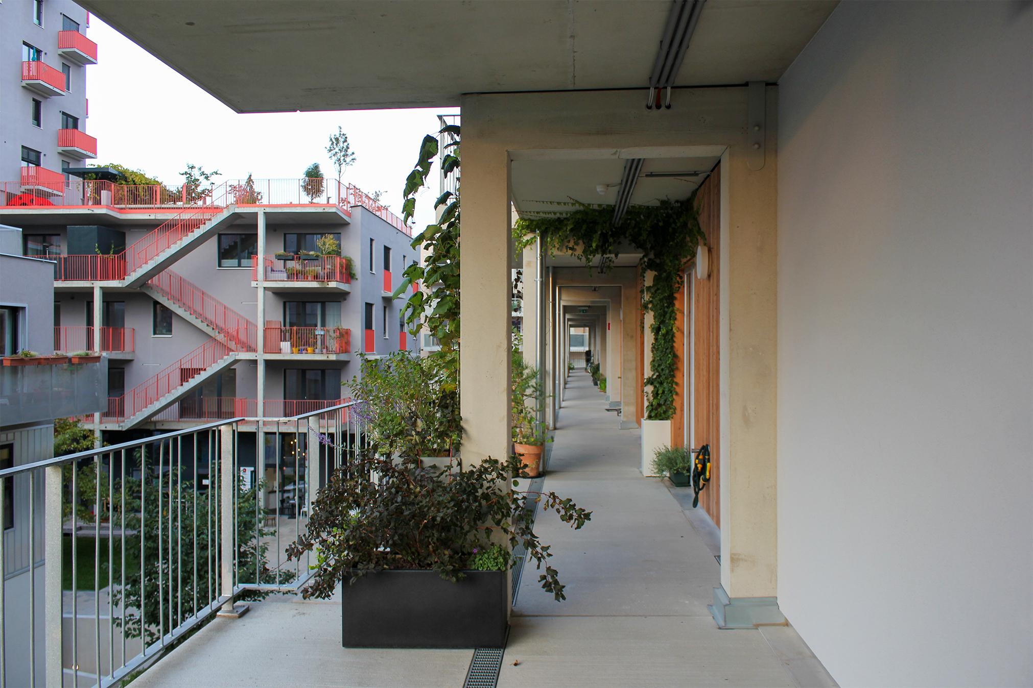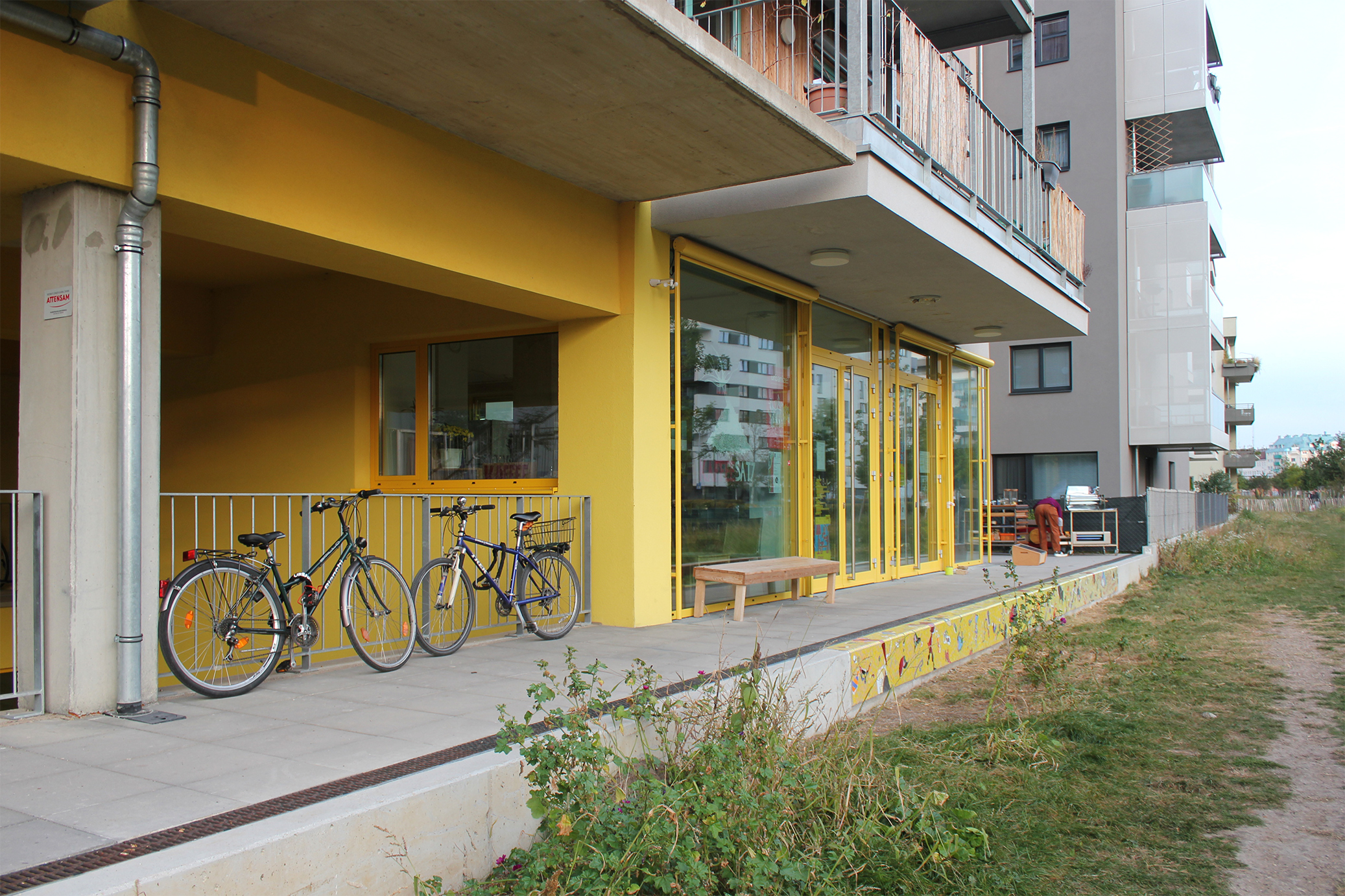Since all residents work 10 to 15 hours per month internally, a cultural event, for example, can be self-organized with their support. In addition, other working groups have been formed if needed. The organization and communication takes place either via social media or analogue on the common areas. The green roof terrace, the laundry room, the communal kitchen, the sauna, the fitness room, and the pergola, which serves both as access point and place to stay, as well as transition from the communal to the private, are all suitable for this purpose.